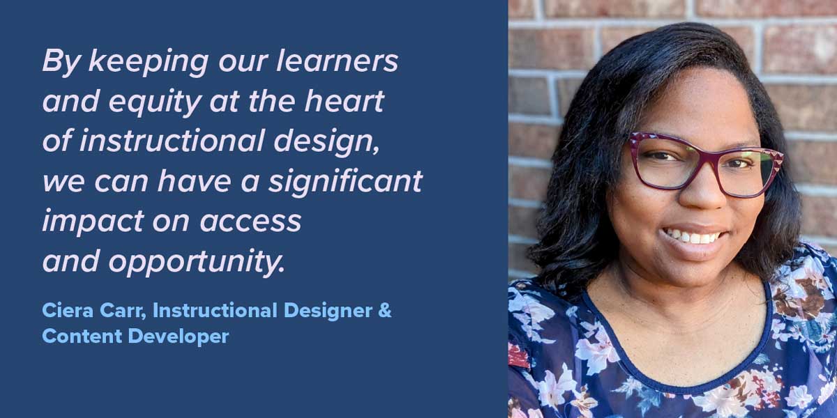 Every learner deserves access to opportunity. Making learning inclusive can support them in exploring every path available to them. That’s one of the reasons I’m passionate about early childhood STEM—introducing little ones to science and technology so every student, including women and students of color, can see themselves excelling in these subjects and related careers. In my preschool and kindergarten classrooms, I used to teach coding and have STEM clubs. I want to infuse those kinds of opportunities into my instructional design today. By keeping our learners and equity at the heart of instructional design, we can have a significant impact on access and opportunity.